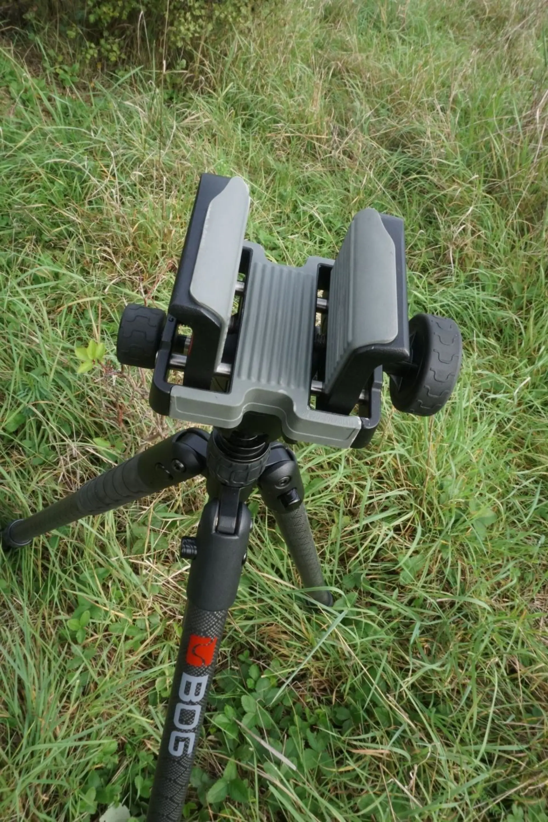 Patentovaná báze s názvem Arca-Swiss je s nohami spojena skrze kloub, který bez přerušení umožňuje otáčení o plných 360° a náklon o 180°. Střelba do/z kopce nebo posedu i pod opravdu ostrým úhlem tedy není nejmenší problém. hlavice je osazena speciální svěrkou, do které se upíná zbraň. V podstatě jde o kompaktní svěrák, zevnitř vystlaný pryžovým materiálem s velkou životností, který se přizpůsobí předpažbí, opravdu pevně jej chytí, ale současně nepoškrábe. O utažení hlavice a svěrky se stará dvojice velkých, dobře ovladatelných pogumovaných točítek. S kulovnicí na kloubu se dobře manipuluje, aniž by bylo třeba podpěru přidržovat. Odpor kloubu lze s trochou citu plynule regulovat, což umožňuje jak rychlé změny polohy, precizní míření i kompletní uzamknutí zbraně ve zvolené poloze. Výhoda svěrky je, že do ní upnete prakticky jakoukoliv zbraň, která za tím účelem nemusí mít žádný montážní bod. Sherpa má svěrku o něco menší než Infinite, ale pořád v dostatečně robustní formě pro jakékoliv použití a lze ji roztáhnout na 60 mm, takže pasovat bude předpažbí jakékoliv kulovnice. Pod středovou tyčí je hák, na který můžete zavěsit batoh, trojnožku jím zatížit a získat stabilitu navíc. Hák působí poměrně subtilně, ale při testu bez problému unesl 20 kg závaží.