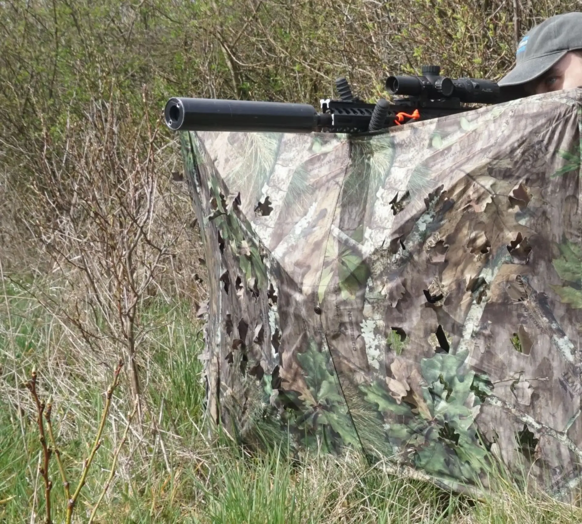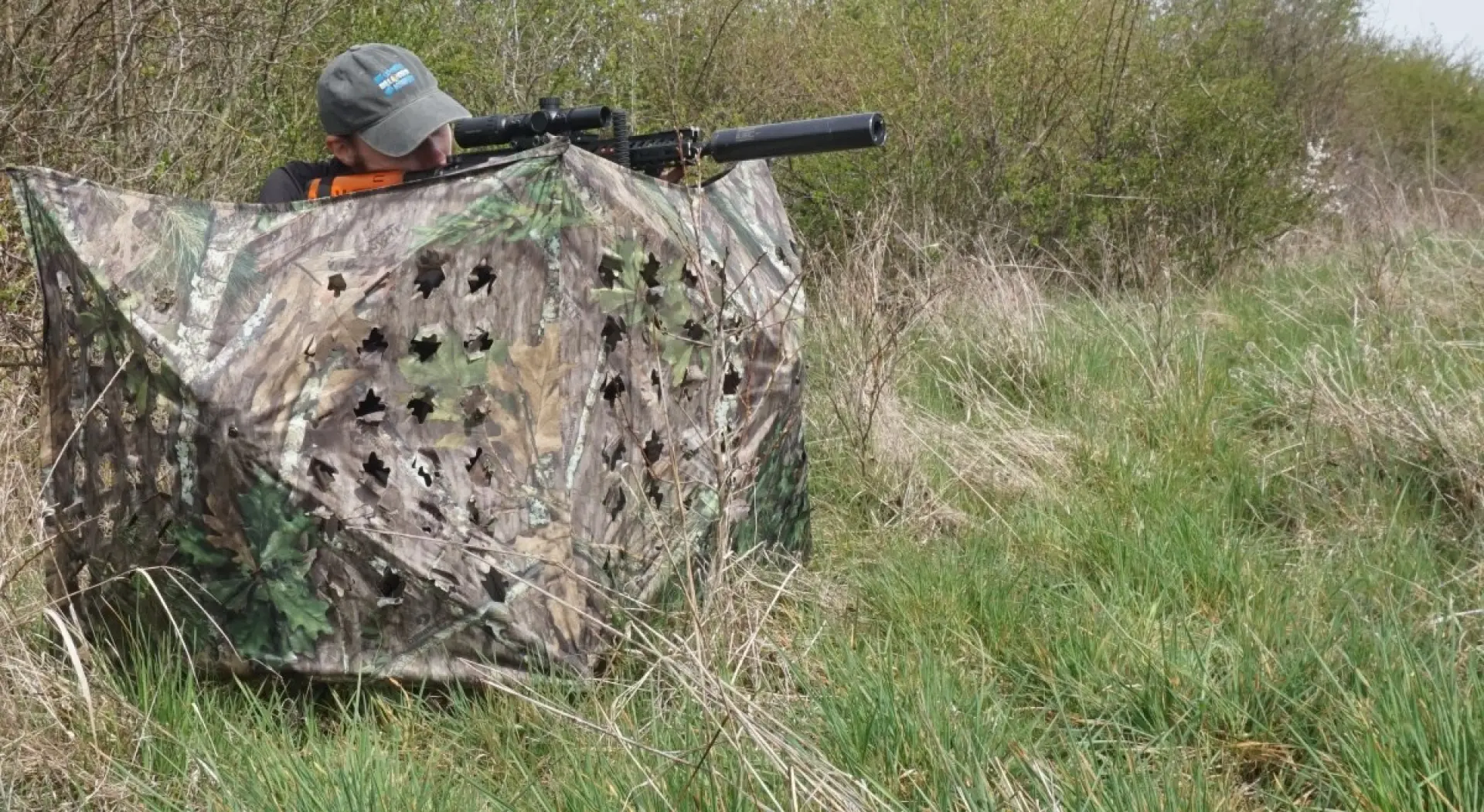 Na zvoleném místě zástěna drží díky integrovaným kolíkům-tyčkám, jednom v každé sekci, které zapíchnete do země. Zástěnu jde použít i tam, kde kolíky neproniknout do podkladu, třeba na skále, protože pokud ji ohnete do tvaru písmene „U“ drží vztyčená sama od sebe. Výška je tak akorát, aby jste při sedu na zemi (nebo na batohu či libovolné podložce) mohli nad hranou zástěny zamířit kulovnicí. Pokud se chcete úplně skrýt je to horší a musíte se sehnout, aby vám nad okrajem nevykukovala hlava. Je to ovšem vymyšlené tak, že máte něco maskovacího na hlavě, a pozorujete okolí, pažbu pušky v klíně a její předpažbí na střelecké holi a když něco přijde posunete ji do střelecké pozice do ramena. Samotný okraj není dost pevný, aby unesl kulovnici, ale „klouby“ kde se stýkají jednotlivé sekce, vám určitou oporu poskytnou. Ve specifickém terénu se nabízí možnost trochu improvizovat, třeba střílet vleže pod spodním okrajem zástěny, nebo prostrčit hlaveň perforací v plášti a mířit dalším prostupem nad ní, nebo na sebe celou zástěnu položit.