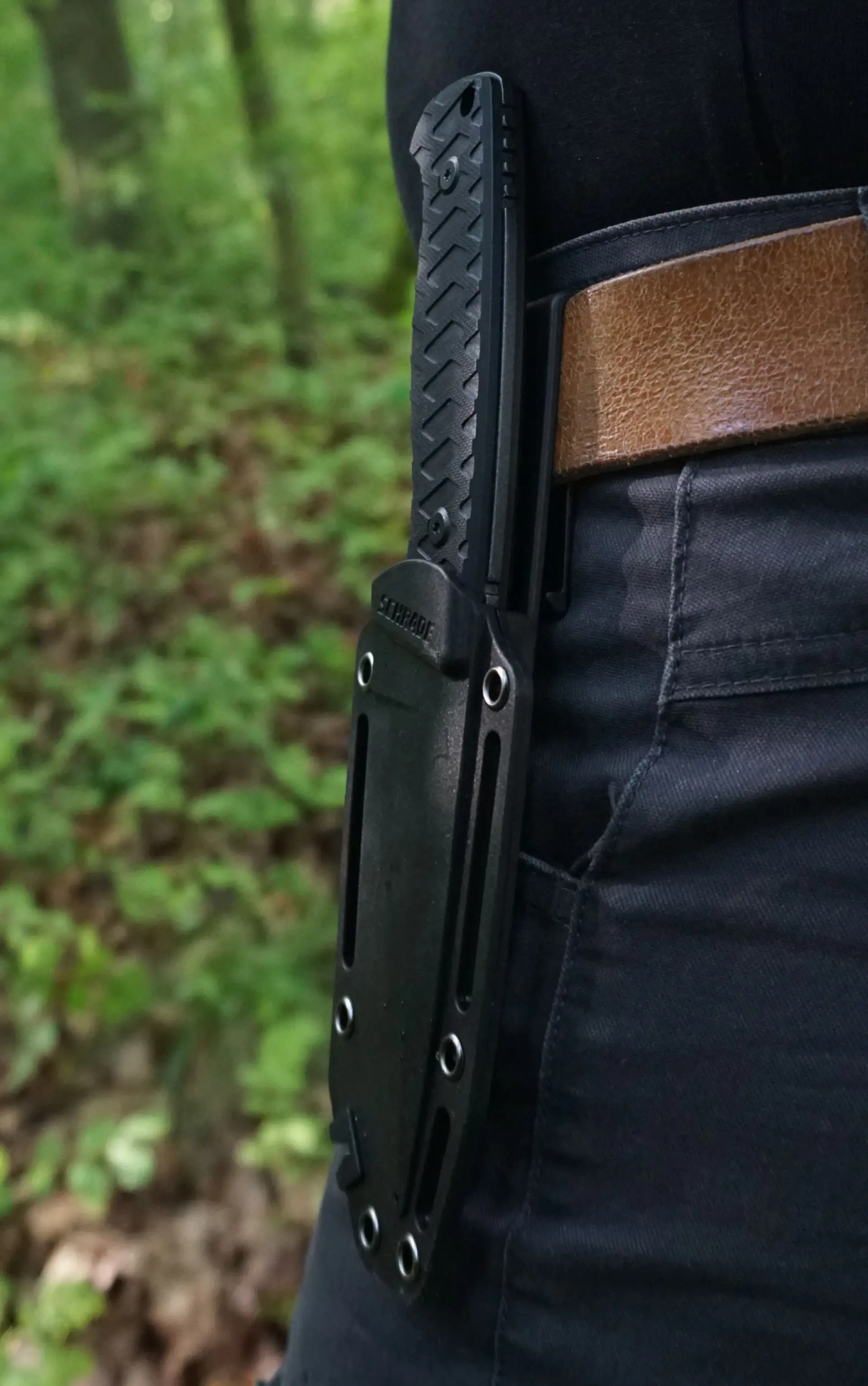 Nůž se na opasek uchycuje přes pružný klip. Výhodou je snadné a rychlé nasazení (do šířky 53 a tloušťky 3,5 mm) bez potřeby opasek sundávat z kalhot a protahovat okem pouzdra. Dokonce ani opasek nepotřebujete, Wolverine docela dobře drží i na lemu kalhot. Nevýhoda řešení spočívá ve vyšší pravděpodobnosti ztráty; mně ale za dobu, co nůž používám, nepotkala. Pokud klipu přece jen nevěříte, na některé opasky půjde pouzdro upevnit klasicky provlečením skrze dva protáhlé otvory po bocích, ale za cenu vyššího umístění nože vůči pasu. Popřípadě lze využít i šestice průvlaků na lanko.
