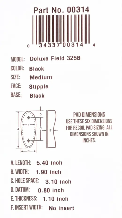 Černá protiskluzová botka s černou základnou Pachmayr F325 Deluxe je oblíbená pro svůj klasický vzhled a výkonné tlumení zpětného rázu. Pro brokovnici nebo pušku.
