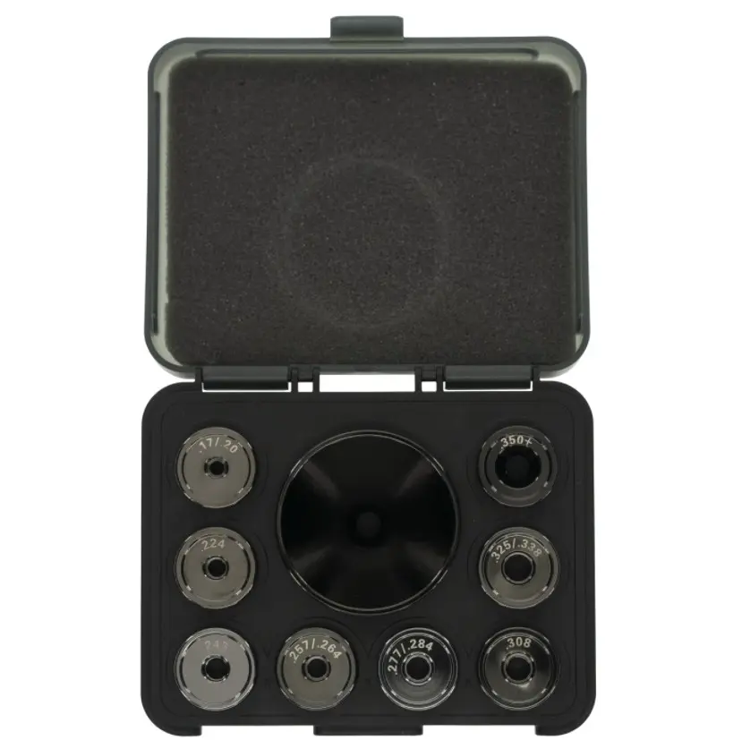 - 8 austauschbare Adapter für die gängigsten Kaliber