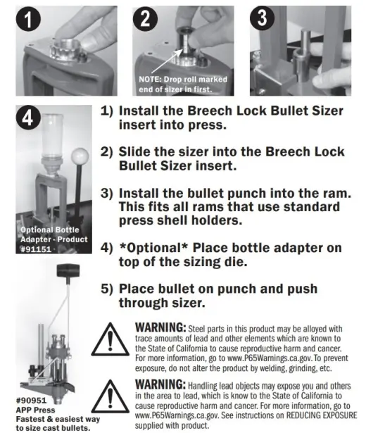 Um das Bullet Sizer & Punch Set Kalibriersatz verwenden zu können, ist es notwendig, ein universelles Breech Lock Bullet Sizer Kit zu besitzen, in das das Kaliber (genannt Sizer) eingesetzt wird. Das Set wurde speziell für die Lee Automatic Processing Press (APP) entwickelt, eignet sich aber für jede Einstationenpresse mit Breech Lock Schnellwechseleinsätzen.