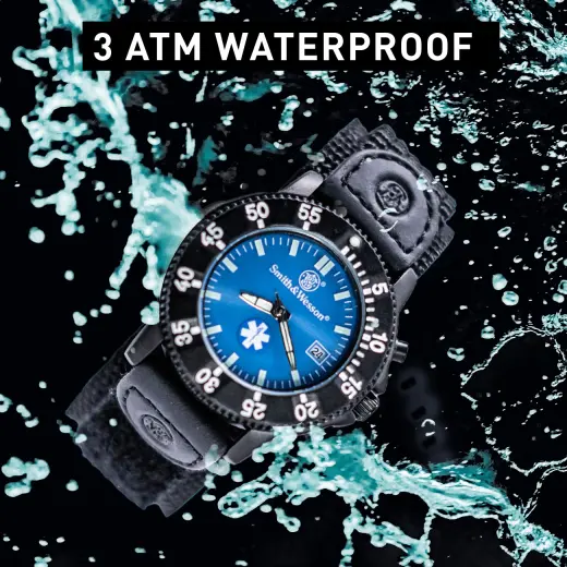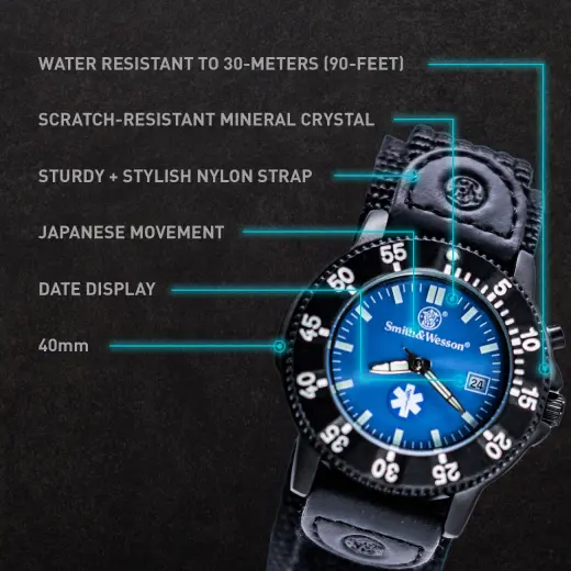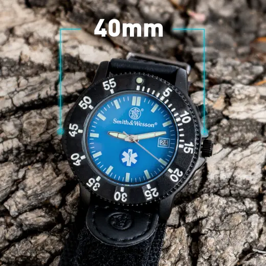 Smith & Wesson EMT Watch. Edelstahlgehäuse, drehbare Lünette, blaues Zifferblatt mit Ambulanzdienstlogo, Datumsanzeige, elektronische Hintergrundbeleuchtung, 3ATM wasserdicht, Nylonarmband. Abmessungen: 40 x 13 mm.