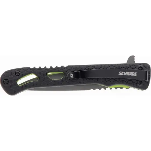 Schrade Klappmesser mit robustem Aluminiumgriff und Drop Point-Klinge aus hochwertigem, rostfreiem AUS-10-Stahl. Das Messer ist mit einem Taschenclip ausgestattet.