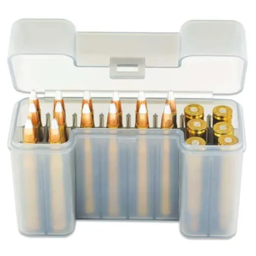 Robuste Kunststoff-Munitionsbox Berry’s #112 für 20 Patronen im Kaliber .300 Ultra Mag., .300 H&H, .300 Win. Mag., 7mm Rem. Mag., 8mm Rem. Mag., .375 H&H und .458 Win. Mag. Stapelbar und transparent.