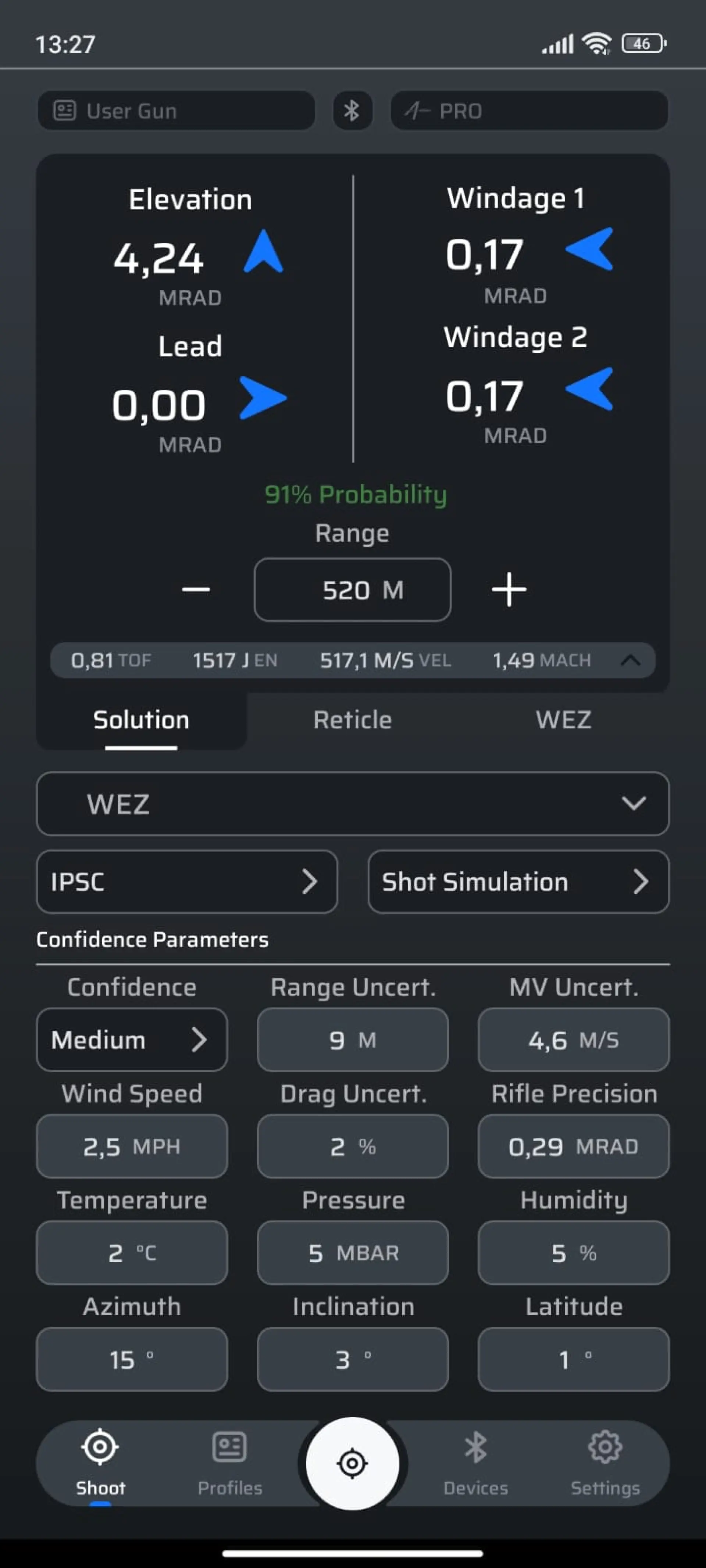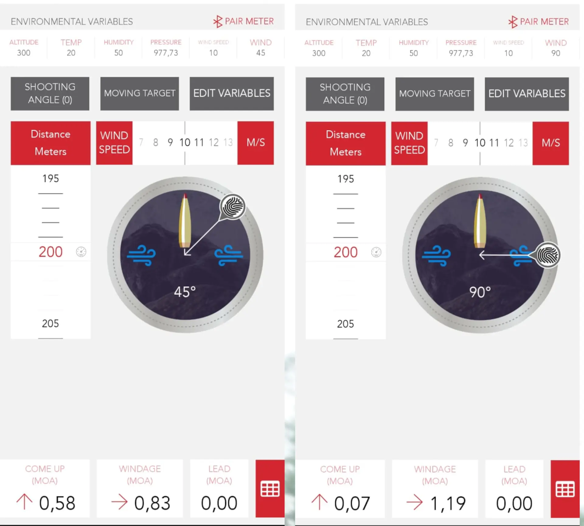 Among all the variables we’ve listed, the one that most significantly affects a bullet’s trajectory is wind direction and speed. Wind blowing from the left pushes the bullet to the right, and vice versa. How much this affects the shot depends on the bullet—its speed, shape, size, and ballistic coefficient (in general, a heavier bullet with a high BC is affected less)—as well as on wind intensity and direction. The longer the distance to the target, the greater the correction needed. With experience, you can roughly estimate wind based on visible heat waves or the classic “wet finger” method, but for accurate readings you’ll need a proper measuring device—an anemometer. For our purposes, compact handheld anemometers that fit in a pocket work well. You can buy them for a few dozen dollars online or in outdoor and electronics shops. A basic “general-sports” version is usually sufficient, though it’s worth investing a bit more in a model tailored specifically to shooters. Some of these can be paired directly with ballistic calculators, but in most cases, you’ll need to manually enter the data. Inside the anemometer is a small “fan” that spins with the wind. The onboard electronics then calculate wind speed in meters per second or another unit. The reading process is simple—turn the device on, raise it above your head to avoid sheltering it from the wind, and slowly rotate along the horizon until you find the direction with the highest speed. This is the wind direction you’ll use for your corrections. Because wind speed fluctuates, you should work with an average. If you’re not in a hurry and your anemometer has an averaging function, take a two-minute reading. Enter the wind speed and direction into your ballistic program, which will then calculate the necessary compensation.