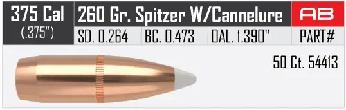 Bullet Nosler AccuBond .375 cal, dia .375, 260grs (16,8g). SKU: 54413. Bullets are equipped with cannelure.