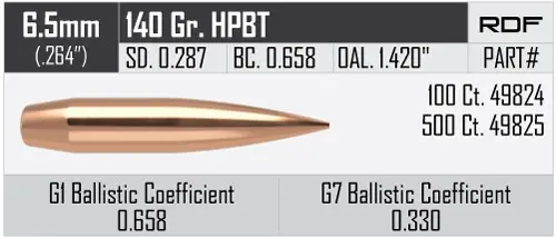 Bullets Nosler Reduced Drag Factor (RDF) 6,5mm, dia .264, 140grs (9g). SKU: 49824