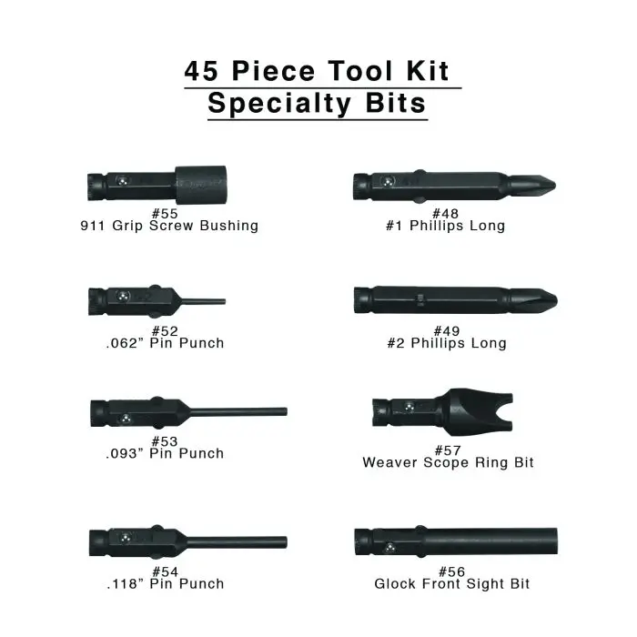 - Special bits for Glock, 1911 and Weaver installations
