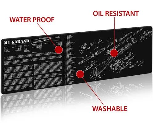 Soft thermoplastic fiber surface ensures your gun won't scratch, while extra thick 1/8" vulcanized rubber protects your work surface and prevents the pad from shifting. This mat will also prevent harmful chemicals, oil and dirt from seeping down onto your table, bench or work surface where you normally clean and maintain your M1 Garand gun.