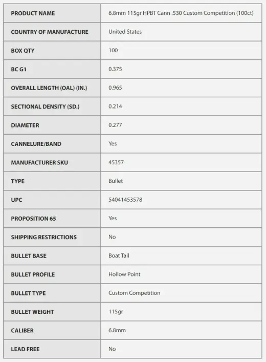 Balle Nosler Custom Competition 6,8 mm, dia .277, 115 grs (7,4 g), HPBT Cann .530. SKU : 45357