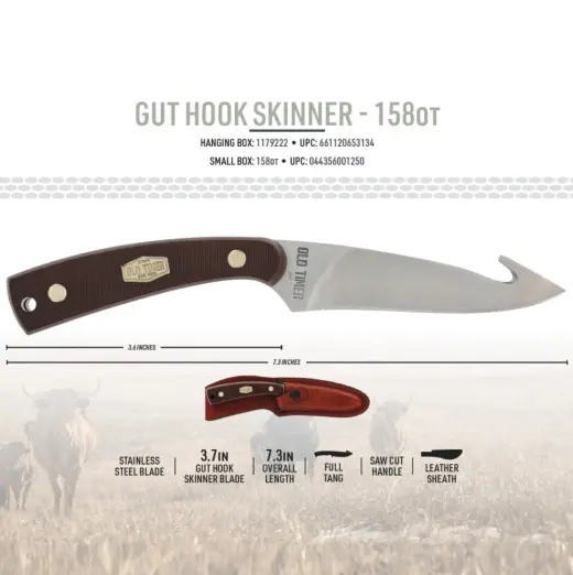 Az Old Timer Gut Hook Skinner 158OT egy robusztus vadászkés, bélbőrrel ellátott a hasüreg tiszta és könnyű felnyitásához a terepen történő vadászat során. öltöztetéshez. A 9,4 cm-es rozsdamentes acél penge éles és precíz vágást biztosít, miközben a bélhorog megkönnyíti a kibelezést a belső szervek sérülésének veszélye nélkül.