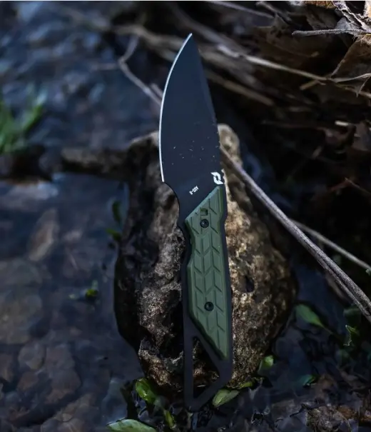 A Drop point penge kiváló minőségű és megbízható AUS-8 rozsdamentes acélból készült. A csúszásmentes, sötétzöld színű Overmold markolat biztos fogást biztosít. A markolat végén egy lyuk található a felakasztáshoz.