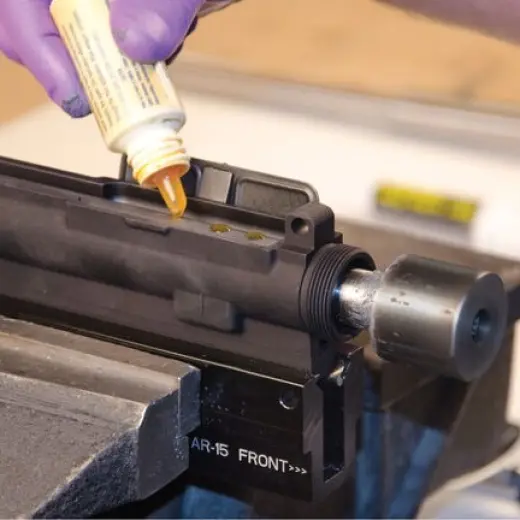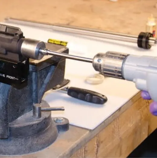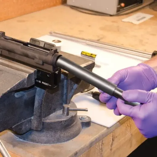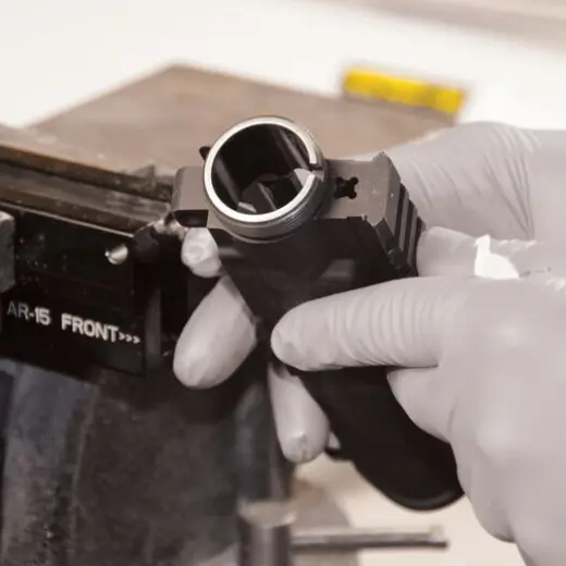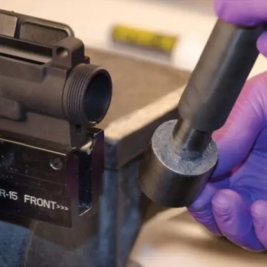 L'allineamento del ricevitore superiore e della canna è fondamentale per la precisione. Lappare il La lappatura della carcassa garantisce una superficie perfettamente quadrata e fedele per l'accoppiamento della canna. e di posizionare in modo ottimale il dado della canna, in modo da ottenere una coppia di serraggio ideale. e il corretto allineamento del foro del tubo del gas. Usare un trapano elettrico o a batteria per o un trapano elettrico per squadrare la faccia del ricevitore di un AR-15. il tubo del gas attraverso i fori del dado della canna, aiuta ad allineare le mire anteriori e posteriori in stile A2. di tipo A2.