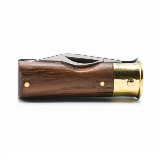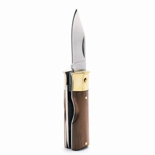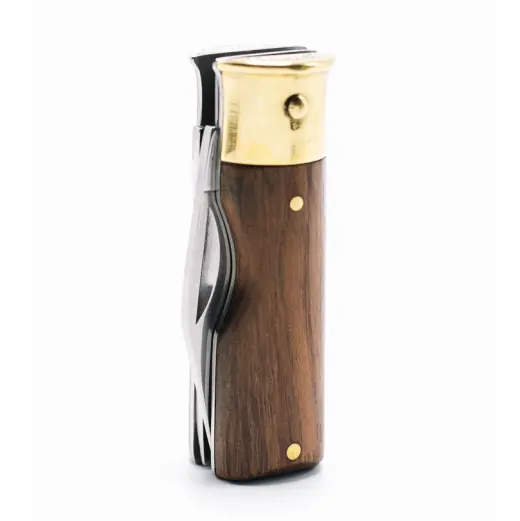 Coltello pieghevole tascabile nello stile di un fucile da caccia con manico in ottone e legno di mogano. Presenta una lama affilata da 5 cm, una lima e un cacciavite a testa piatta.