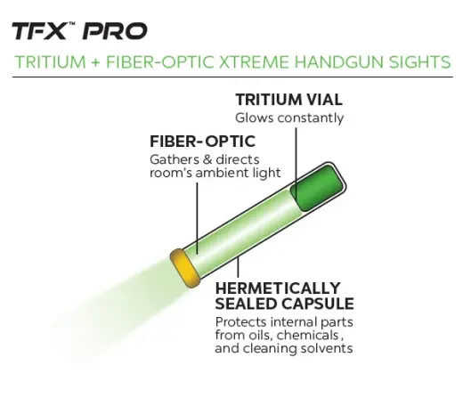 Jasně zářící ve dne i v noci, mířidla TFX PRO jsou vždy připravena. Tritiová mířidla TRUGLO TFX přecházejí za denního světla ze standardních mířidel s bílými body na svítící zelené body ve tmě. Tritium nepotřebuje baterie ani se nemusí nabíjet světlem – jednoduše svítí!