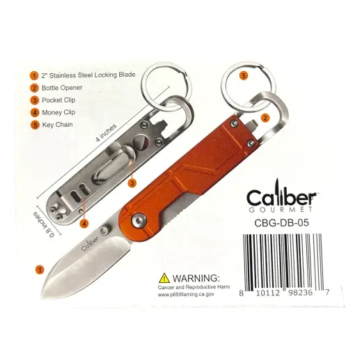 Składany nóż Caliber Gourmet z otwieraczem do butelek, klipsem do kieszeni i kółkiem do kluczy. Ostrze ze stali nierdzewnej z blokadą, długość ostrza 5 cm (2"). Dostępny w trzech kolorach.