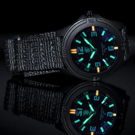 Zegarek na ekstremalne warunki. Wodoodporność 10 ATM, szwajcarskie Tritium H3 dla 20 lat świecenia, datownik, odporne na zarysowania szkło, 43 x 12 mm. Gumowy i nylonowy pasek.