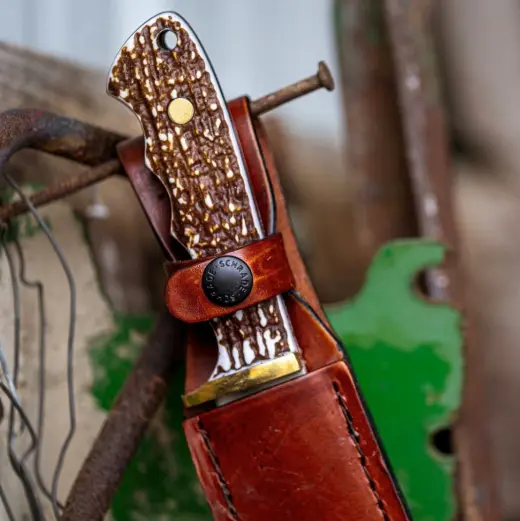 Součástí nože je kožené pouzdro s poutkem na opasek a otvor pro provlečení šňůrky, aby byl nůž vždy po ruce — ideální společník pro lov, camping, bushcraft nebo survival.