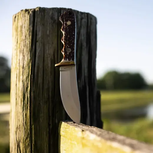 Lovecký nůž s pevnou čepelí, navržený pro přesnou práci v přírodě. Je ideální na stahování kůže, porcování ulovené zvěře i univerzální outdoorové použití. Čepel o délce 11,7 cm je vyrobena z vysoce uhlíkové nerezové oceli a má klasický zakřivený tvar Skinner a jemný hrot umožňující precizní řezy bez poškození masa nebo kůže.