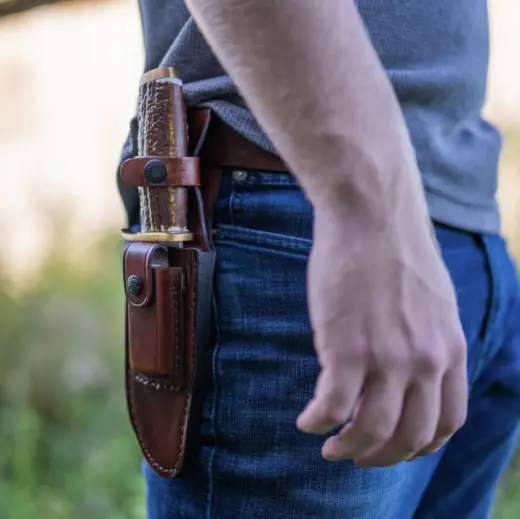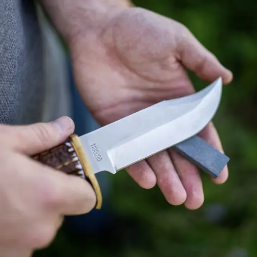 Součástí nože je kožené pouzdro na opasek s praktickou kapsou na přiložený brusný kámen, který oceníte při práci v terénu.