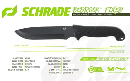 Schrade Bedrock Fixed Blade, ze třídy Schrade Delta, ztělesňuje robustní a spolehlivý nůž s bezkonkurenční přesností, odolností a špičkovým designem, který od značky Schrade očekáváte.