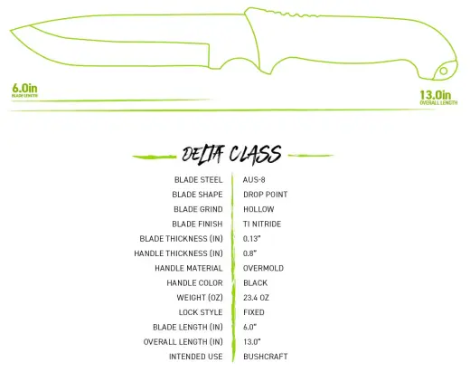 Čepel nože ve tvaru Drop point je vyrobena z velmi kvalitní a odolné nerezové oceli AUS-8 s černou povrchovou úpravou. Protiskluzová, pogumovaná rukojeť Overmold zajišťuje pevný úchop. Na konci rukojeti je otvor pro zavěšení.