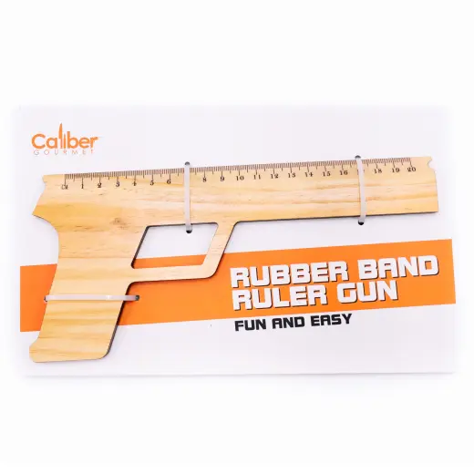 Zábavné pravítko Caliber Gourmet ve tvaru pistole s funkcí střílení gumiček – stačí natáhnout, zamířit a vystřelit. Měřítko v cm i palcích. Spojte pracovní či školní povinnosti se zábavou.
