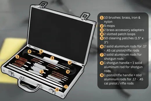 Univerzální sada na čištění zbraní pro pistole, pušky a brokovnice (.17 - .45 cal). Obsahuje kartáčky, mopy, hliníkové tyče a další příslušenství. Vše přehledně uspořádáno v odolném hliníkovém kufříku.