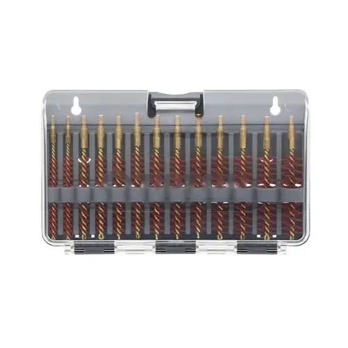 Sada obsahuje 13 kartáčků pro kalibry .17 až .45 a je uložena v odolné plastové krabičce s víkem, kde má každý kartáček vlastní umístění označené podle kalibru – orientace je tak rychlá a přehledná.