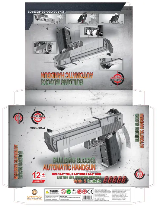 Stavebnice modelu automatické pistole s funkčními mířidly i spouští. Střílí plastové projektily. Dodáváno s municí. Caliber Precision Building Blocks Hand Gun Toy.