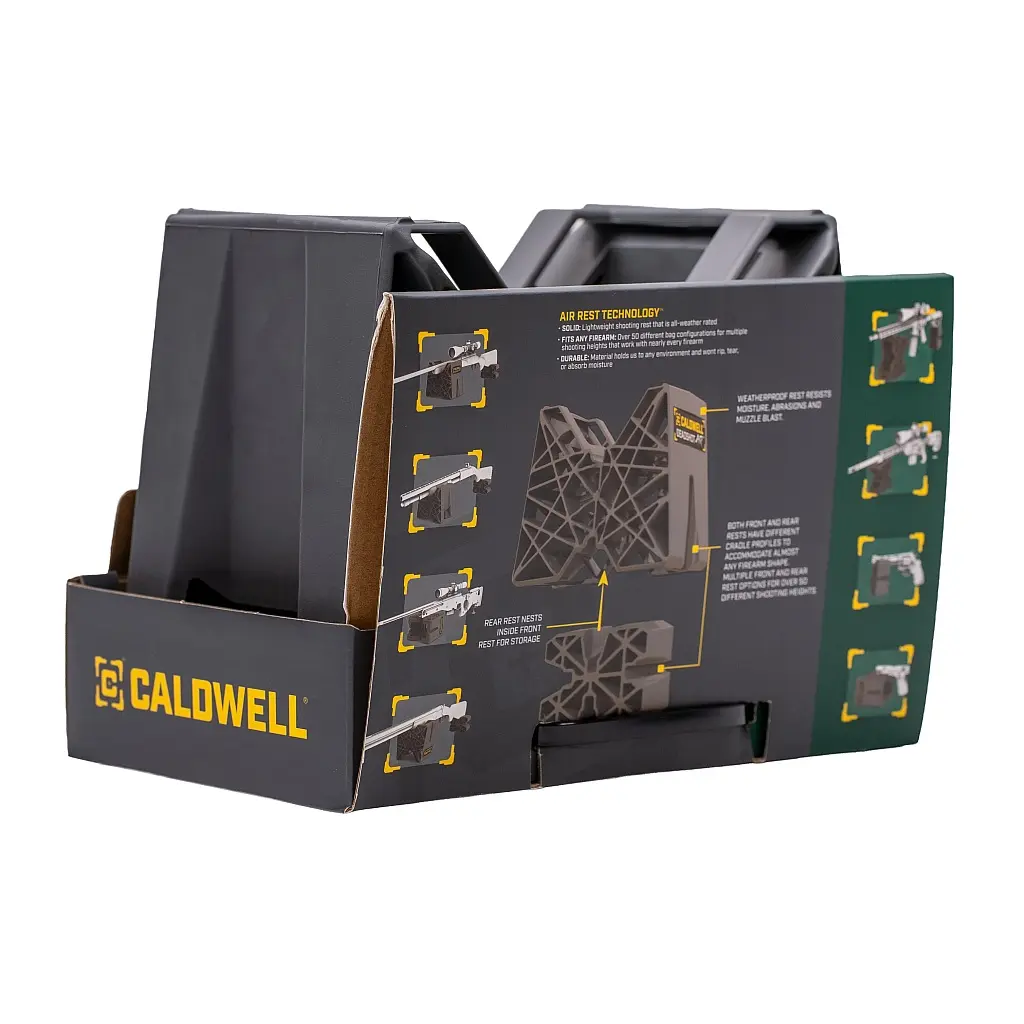 Díky osvědčené konstrukci a technologii Caldwell Air Rest Technology™ nabízí sada DeadShot Air Front and Rear Shooting Rest Combo ještě více funkcí. Tvarovaný materiál odolný vůči povětrnostním vlivům zvládá náročné podmínky a umožňuje uložit zadní vak do předního pro snadné skladování.