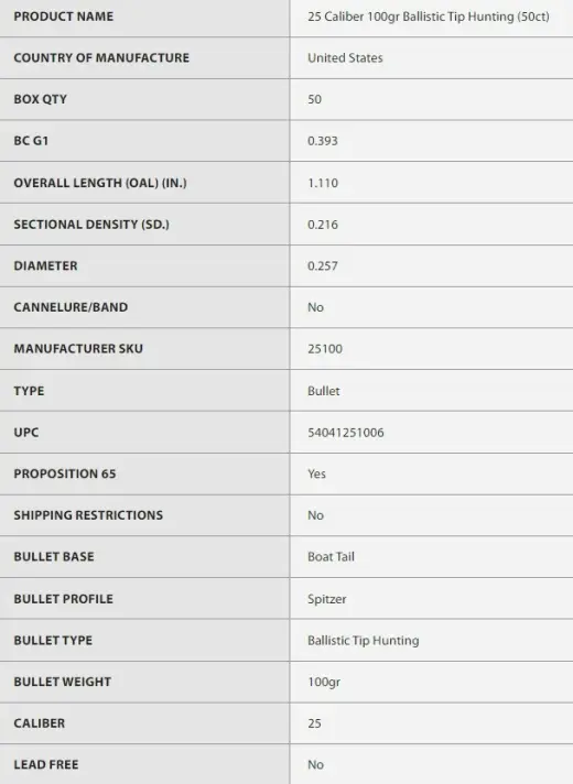 Střela Nosler Ballistic Tip Hunting 25 Cal, dia .257, 100grs (6,4g). SKU: 25100