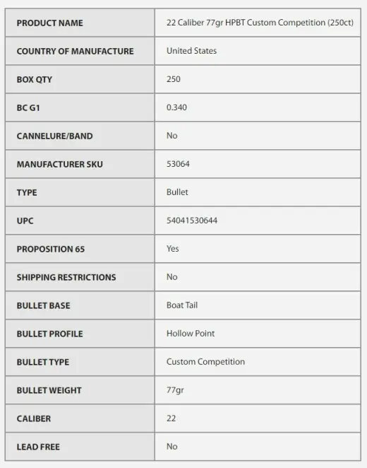 Střela Nosler Custom Competition .22 Cal., dia .224, 77grs (5g), HPBT. SKU: 53064