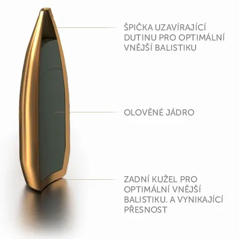Střela má olověné jádro, dutou špičku (Hollow-Point) a zadní kužel (Boat Tail) pro optimální vnější balistiku a vynikající přesnost.