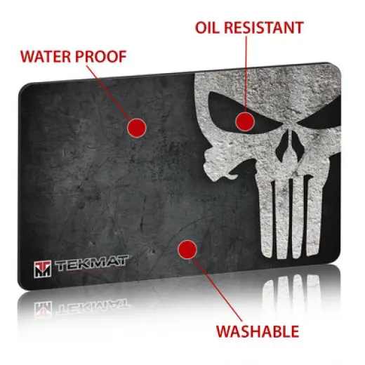 Originální podložka TekMat s potiskem Punisher Grunge pro čištění a údržbu zbraní. Tyto 17" (43cm) podložky TekMat jsou dostatečně velké, aby se na ně vešla plně rozebraná pistole a zbylo místo na nářadí a příslušenství.