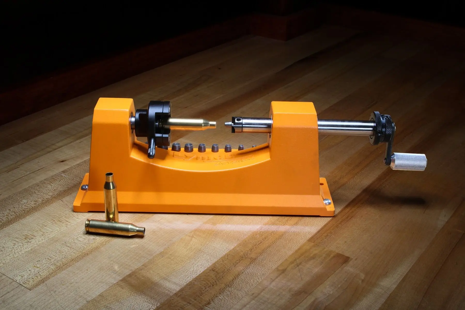 Univerzální hliníkový zkracovač nábojnic. Patentovaný univerzání držák nábojnic si poradí s jakoukoliv nábojnici od ráže .17 do ráže .458.
